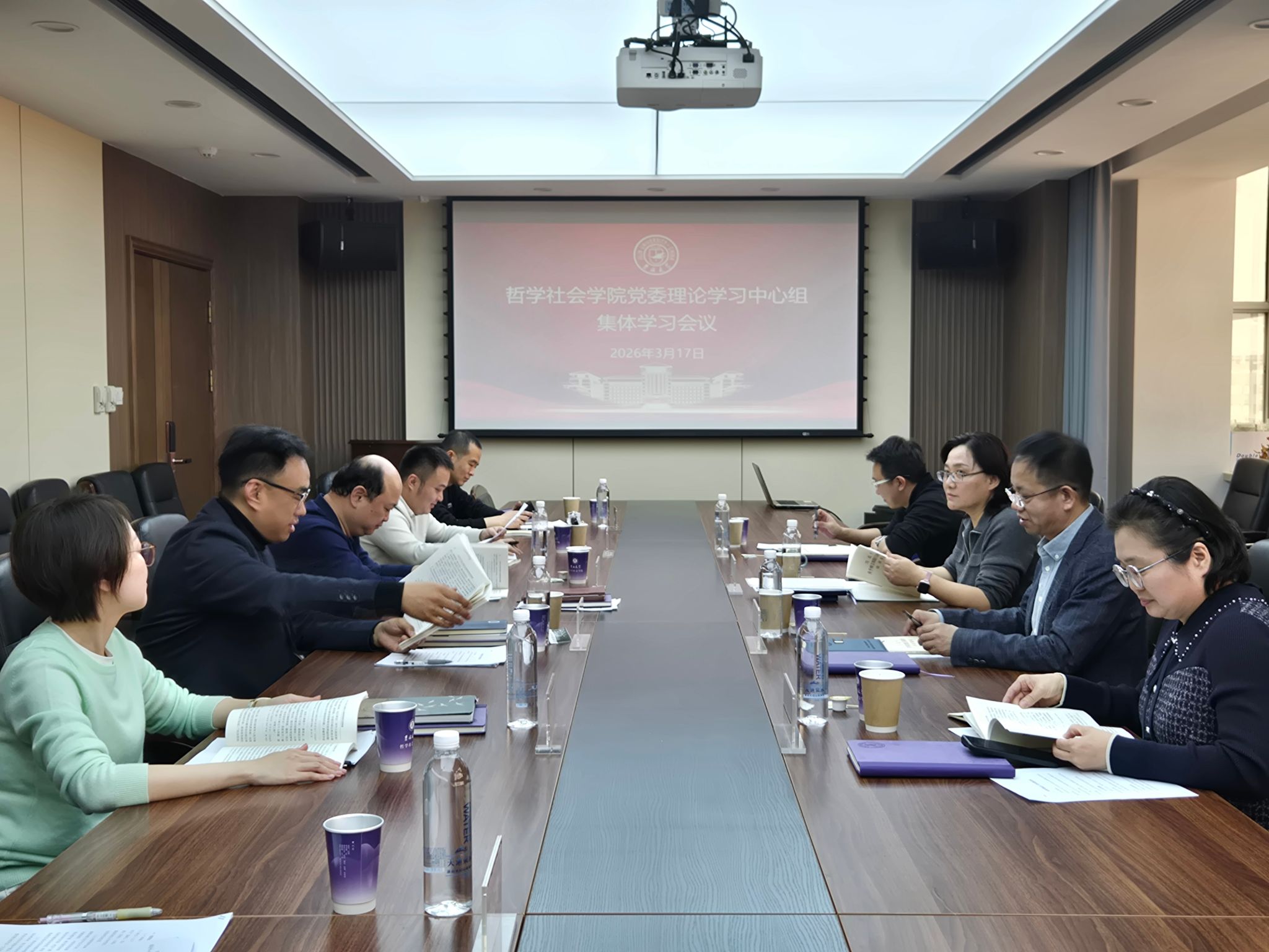 【校内办公网】3月17日上午,哲学社会学院树立和践行正确政绩观学习教育读书班开班仪式暨党委理论学习中心组集体学习会议在东荣大厦908会议室举行。学院领导班子成员、学院党委理论学习中心组成员和党建工作联络员李丹同志参加会议。会议由学院党委书记张晓萌主持。